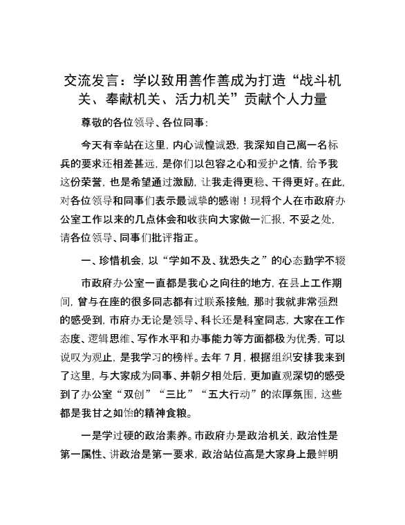 交流发言:学以致用 善作善成 为打造“战斗机关、奉献机关、活力机关”贡献个人力量 2024-06-26 Word模板 133 购买前,请一定要先点击这里看看,欢迎持续关注,精彩模板每天推送 预览结束,本文件为word文档,一共5页,共2385字,请购买后,下载后查看 购买前,请一定要先点击这里看看,欢迎持续关注,精彩模板每天推送 资源下载下载价格29 RMBVIP免费升级VIP点击检测网盘有效后购买有任何充值和下载问题请加微信:xuexixuexi66 0 演讲发言