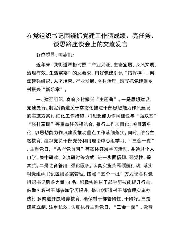 在党组织书记围绕抓党建工作晒成绩、亮任务、谈思路座谈会上的交流发言 2024-06-26 Word模板 102 购买前,请一定要先点击这里看看,欢迎持续关注,精彩模板每天推送 预览结束,本文件为word文档,一共4页,共1893字,请购买后,下载后查看 购买前,请一定要先点击这里看看,欢迎持续关注,精彩模板每天推送 资源下载下载价格29 RMBVIP免费升级VIP点击检测网盘有效后购买有任何充值和下载问题请加微信:xuexixuexi66 0 演讲发言