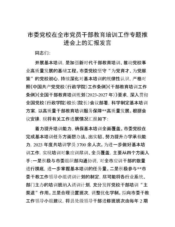 市委党校在全市党员干部教育培训工作专题推进会上的汇报发言 2024-06-26 Word模板 103 购买前,请一定要先点击这里看看,欢迎持续关注,精彩模板每天推送 预览结束,本文件为word文档,一共4页,共1571字,请购买后,下载后查看 购买前,请一定要先点击这里看看,欢迎持续关注,精彩模板每天推送 资源下载下载价格29 RMBVIP免费升级VIP点击检测网盘有效后购买有任何充值和下载问题请加微信:xuexixuexi66 0 演讲发言