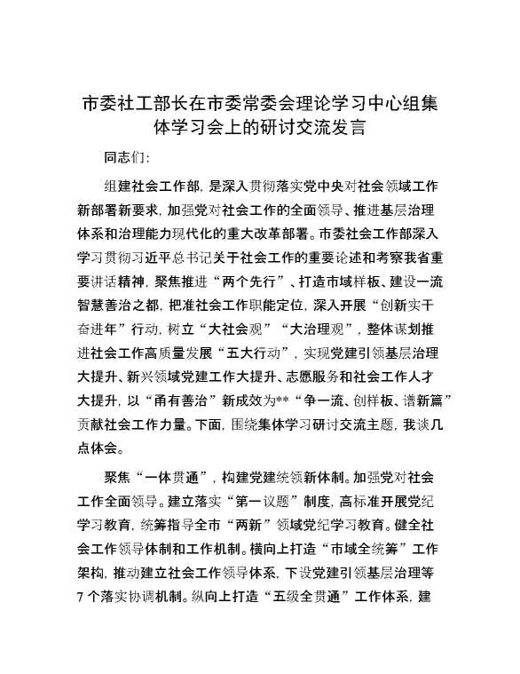 市委社工部长在市委常委会理论学习中心组集体学习会上的研讨交流发言 2024-06-26 Word模板 107 购买前,请一定要先点击这里看看,欢迎持续关注,精彩模板每天推送 预览结束,本文件为word文档,一共4页,共1787字,请购买后,下载后查看 购买前,请一定要先点击这里看看,欢迎持续关注,精彩模板每天推送 资源下载下载价格29 RMBVIP免费升级VIP点击检测网盘有效后购买有任何充值和下载问题请加微信:xuexixuexi66 0 演讲发言