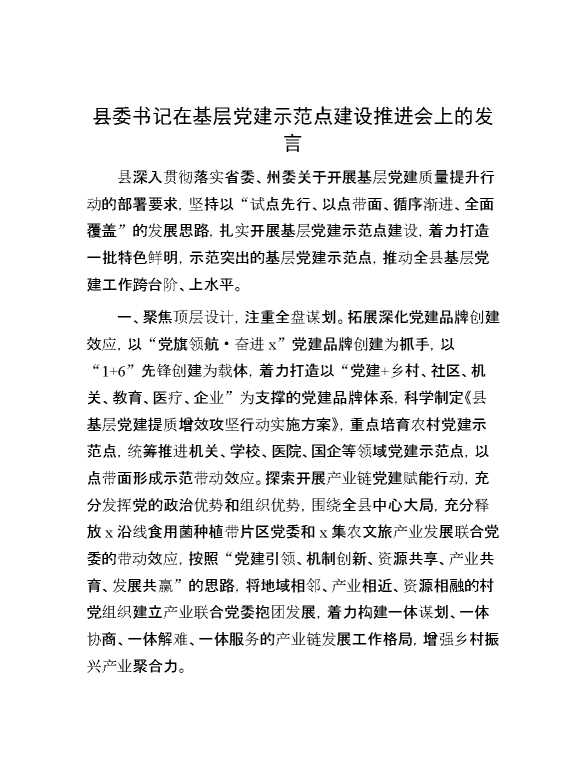 县委书记在基层党建示范点建设推进会上的发言 2024-06-26 Word模板 104 购买前,请一定要先点击这里看看,欢迎持续关注,精彩模板每天推送 预览结束,本文件为word文档,一共3页,共1339字,请购买后,下载后查看 购买前,请一定要先点击这里看看,欢迎持续关注,精彩模板每天推送 资源下载下载价格29 RMBVIP免费升级VIP点击检测网盘有效后购买有任何充值和下载问题请加微信:xuexixuexi66 0 演讲发言