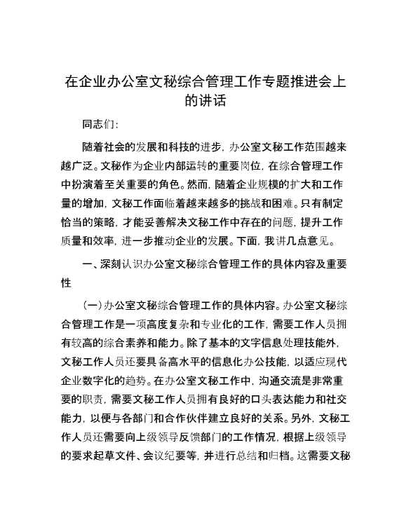 在企业办公室文秘综合管理工作专题推进会上的讲话 2024-06-26 Word模板 115 购买前,请一定要先点击这里看看,欢迎持续关注,精彩模板每天推送 预览结束,本文件为word文档,一共8页,共3778字,请购买后,下载后查看 购买前,请一定要先点击这里看看,欢迎持续关注,精彩模板每天推送 资源下载下载价格29 RMBVIP免费升级VIP点击检测网盘有效后购买有任何充值和下载问题请加微信:xuexixuexi66 0 演讲发言