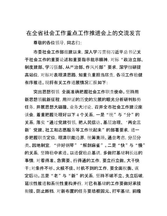 在全省社会工作重点工作推进会上的交流发言 2024-06-26 Word模板 108 购买前,请一定要先点击这里看看,欢迎持续关注,精彩模板每天推送 预览结束,本文件为word文档,一共4页,共1722字,请购买后,下载后查看 购买前,请一定要先点击这里看看,欢迎持续关注,精彩模板每天推送 资源下载下载价格29 RMBVIP免费升级VIP点击检测网盘有效后购买有任何充值和下载问题请加微信:xuexixuexi66 0 演讲发言