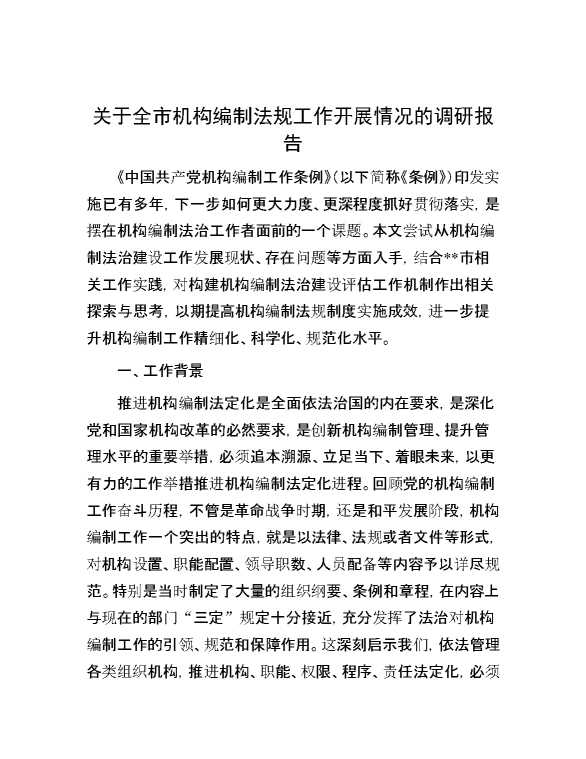 关于全市机构编制法规工作开展情况的调研报告 2024-07-01 Word模板 107 购买前,请一定要先点击这里看看,欢迎持续关注,精彩模板每天推送 预览结束,本文件为word文档,一共10页,共4964字,请购买后,下载后查看 购买前,请一定要先点击这里看看,欢迎持续关注,精彩模板每天推送 资源下载下载价格29 RMBVIP免费升级VIP点击检测网盘有效后购买有任何充值和下载问题请加微信:xuexixuexi66 0 总结汇报