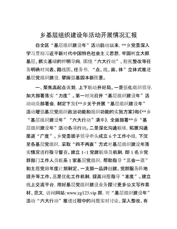 乡基层组织建设年活动开展情况汇报 2024-07-01 Word模板 109 购买前,请一定要先点击这里看看,欢迎持续关注,精彩模板每天推送 预览结束,本文件为word文档,一共4页,共1601字,请购买后,下载后查看 购买前,请一定要先点击这里看看,欢迎持续关注,精彩模板每天推送 资源下载下载价格29 RMBVIP免费升级VIP点击检测网盘有效后购买有任何充值和下载问题请加微信:xuexixuexi66 0 总结汇报