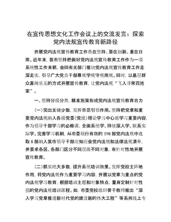在宣传思想文化工作会议上的交流发言:探索党内法规宣传教育新路径 2024-07-04 Word模板 109 购买前,请一定要先点击这里看看,欢迎持续关注,精彩模板每天推送 预览结束,本文件为word文档,一共4页,共1761字,请购买后,下载后查看 购买前,请一定要先点击这里看看,欢迎持续关注,精彩模板每天推送 资源下载下载价格29 RMBVIP免费升级VIP点击检测网盘有效后购买有任何充值和下载问题请加微信:xuexixuexi66 0 演讲发言