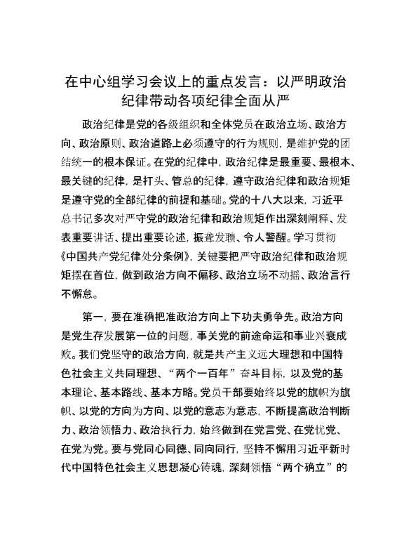在中心组学习会议上的重点发言:以严明政治纪律带动各项纪律全面从严 2024-07-04 Word模板 105 购买前,请一定要先点击这里看看,欢迎持续关注,精彩模板每天推送 预览结束,本文件为word文档,一共3页,共1054字,请购买后,下载后查看 购买前,请一定要先点击这里看看,欢迎持续关注,精彩模板每天推送 资源下载下载价格29 RMBVIP免费升级VIP点击检测网盘有效后购买有任何充值和下载问题请加微信:xuexixuexi66 0 演讲发言