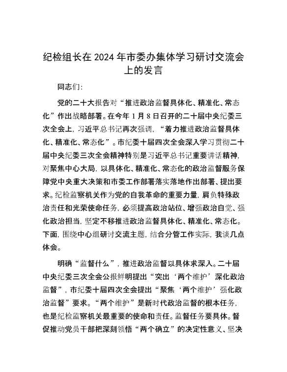 纪检组长在2024年市委办集体学习研讨交流会上的发言 2024-07-04 Word模板 121 购买前,请一定要先点击这里看看,欢迎持续关注,精彩模板每天推送 预览结束,本文件为word文档,一共4页,共1649字,请购买后,下载后查看 购买前,请一定要先点击这里看看,欢迎持续关注,精彩模板每天推送 资源下载下载价格29 RMBVIP免费升级VIP点击检测网盘有效后购买有任何充值和下载问题请加微信:xuexixuexi66 0 演讲发言