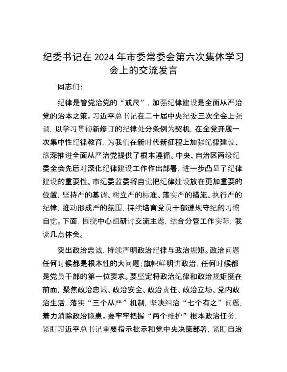 纪委书记在2024年市委常委会第六次集体学习会上的交流发言 2024-07-04 Word模板 116 购买前,请一定要先点击这里看看,欢迎持续关注,精彩模板每天推送 预览结束,本文件为word文档,一共4页,共1777字,请购买后,下载后查看 购买前,请一定要先点击这里看看,欢迎持续关注,精彩模板每天推送 资源下载下载价格29 RMBVIP免费升级VIP点击检测网盘有效后购买有任何充值和下载问题请加微信:xuexixuexi66 0 演讲发言