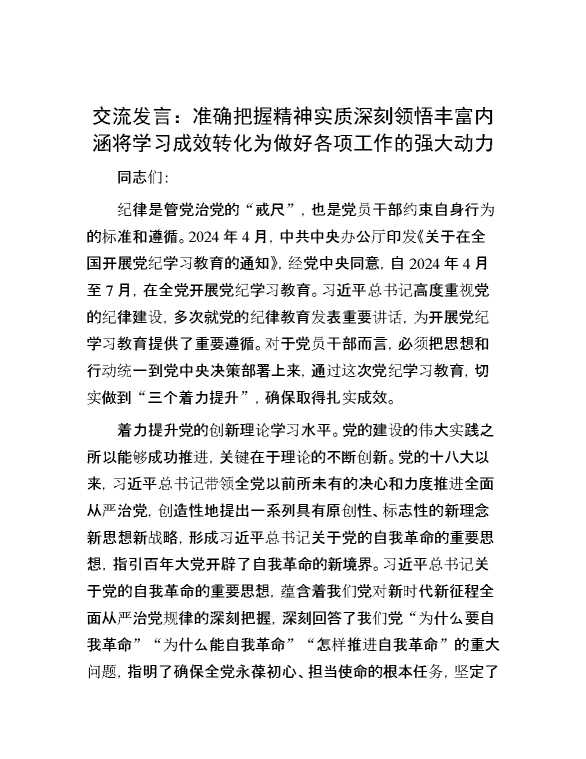 交流发言:准确把握精神实质 深刻领悟丰富内涵 将学习成效转化为做好各项工作的强大动力 2024-07-04 Word模板 108 购买前,请一定要先点击这里看看,欢迎持续关注,精彩模板每天推送 预览结束,本文件为word文档,一共5页,共2222字,请购买后,下载后查看 购买前,请一定要先点击这里看看,欢迎持续关注,精彩模板每天推送 资源下载下载价格29 RMBVIP免费升级VIP点击检测网盘有效后购买有任何充值和下载问题请加微信:xuexixuexi66 0 演讲发言