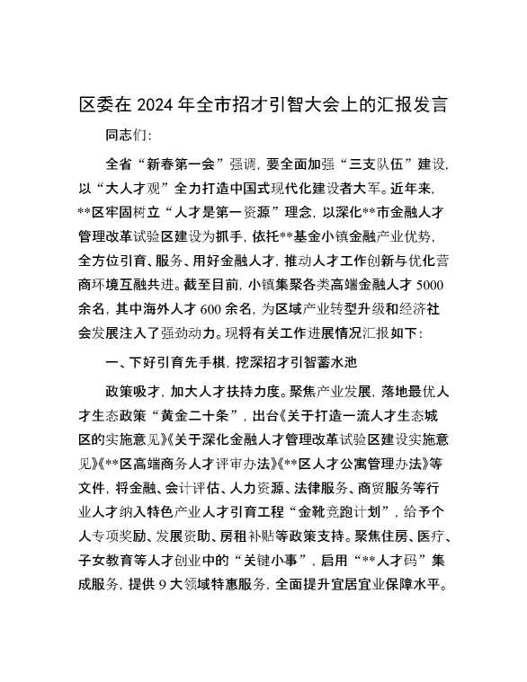 区委在2024年全市招才引智大会上的汇报发言 2024-07-04 Word模板 111 购买前,请一定要先点击这里看看,欢迎持续关注,精彩模板每天推送 预览结束,本文件为word文档,一共5页,共2346字,请购买后,下载后查看 购买前,请一定要先点击这里看看,欢迎持续关注,精彩模板每天推送 资源下载下载价格29 RMBVIP免费升级VIP点击检测网盘有效后购买有任何充值和下载问题请加微信:xuexixuexi66 0 演讲发言