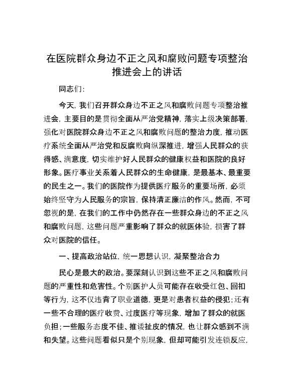在医院群众身边不正之风和腐败问题专项整治推进会上的讲话 2024-07-04 Word模板 122 购买前,请一定要先点击这里看看,欢迎持续关注,精彩模板每天推送 预览结束,本文件为word文档,一共3页,共1412字,请购买后,下载后查看 购买前,请一定要先点击这里看看,欢迎持续关注,精彩模板每天推送 资源下载下载价格29 RMBVIP免费升级VIP点击检测网盘有效后购买有任何充值和下载问题请加微信:xuexixuexi66 0 演讲发言