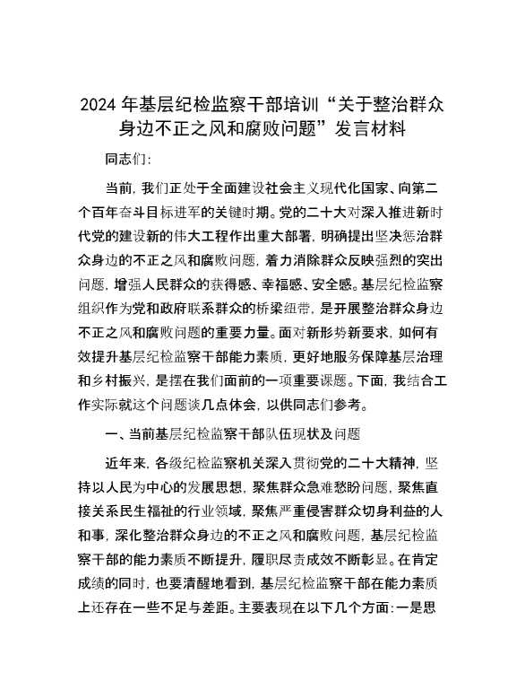 2024年基层纪检监察干部培训“关于整治群众身边不正之风和腐败问题”发言材料 2024-07-04 Word模板 126 购买前,请一定要先点击这里看看,欢迎持续关注,精彩模板每天推送 预览结束,本文件为word文档,一共7页,共3232字,请购买后,下载后查看 购买前,请一定要先点击这里看看,欢迎持续关注,精彩模板每天推送 资源下载下载价格29 RMBVIP免费升级VIP点击检测网盘有效后购买有任何充值和下载问题请加微信:xuexixuexi66 0 演讲发言