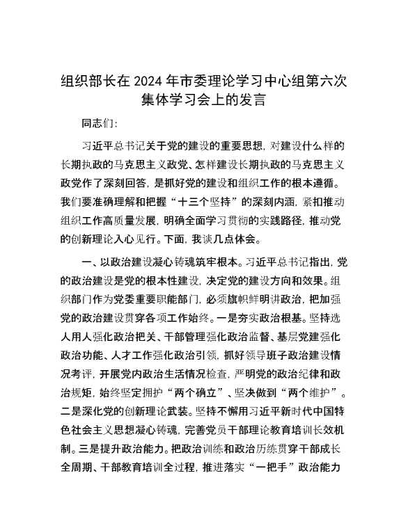 组织部长在2024年市委理论学习中心组第六次集体学习会上的发言 2024-07-04 Word模板 134 购买前,请一定要先点击这里看看,欢迎持续关注,精彩模板每天推送 预览结束,本文件为word文档,一共5页,共2107字,请购买后,下载后查看 购买前,请一定要先点击这里看看,欢迎持续关注,精彩模板每天推送 资源下载下载价格29 RMBVIP免费升级VIP点击检测网盘有效后购买有任何充值和下载问题请加微信:xuexixuexi66 0 演讲发言