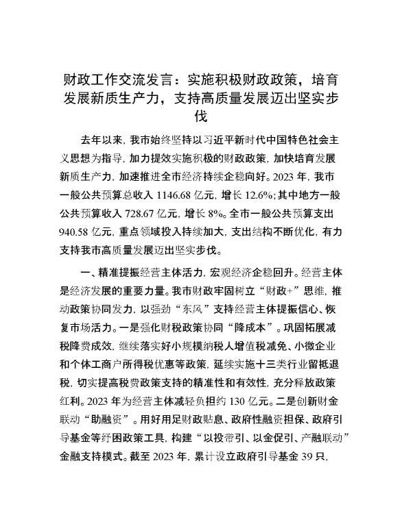 财政工作交流发言:实施积极财政政策,培育发展新质生产力,支持高质量发展迈出坚实步伐 2024-07-04 Word模板 120 购买前,请一定要先点击这里看看,欢迎持续关注,精彩模板每天推送 预览结束,本文件为word文档,一共6页,共2817字,请购买后,下载后查看 购买前,请一定要先点击这里看看,欢迎持续关注,精彩模板每天推送 资源下载下载价格29 RMBVIP免费升级VIP点击检测网盘有效后购买有任何充值和下载问题请加微信:xuexixuexi66 0 演讲发言