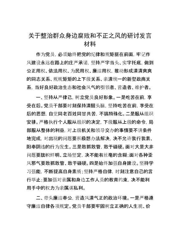 关于整治群众身边腐败和不正之风的研讨发言材料 2024-07-04 Word模板 116 购买前,请一定要先点击这里看看,欢迎持续关注,精彩模板每天推送 预览结束,本文件为word文档,一共4页,共1975字,请购买后,下载后查看 购买前,请一定要先点击这里看看,欢迎持续关注,精彩模板每天推送 资源下载下载价格29 RMBVIP免费升级VIP点击检测网盘有效后购买有任何充值和下载问题请加微信:xuexixuexi66 0 演讲发言