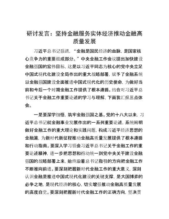 研讨发言:坚持金融服务实体经济 推动金融高质量发展 2024-07-16 Word模板 100 购买前,请一定要先点击这里看看,欢迎持续关注,精彩模板每天推送 预览结束,本文件为word文档,一共4页,共1603字,请购买后,下载后查看 购买前,请一定要先点击这里看看,欢迎持续关注,精彩模板每天推送 资源下载下载价格29 RMBVIP免费升级VIP点击检测网盘有效后购买有任何充值和下载问题请加微信:xuexixuexi66 0 演讲发言