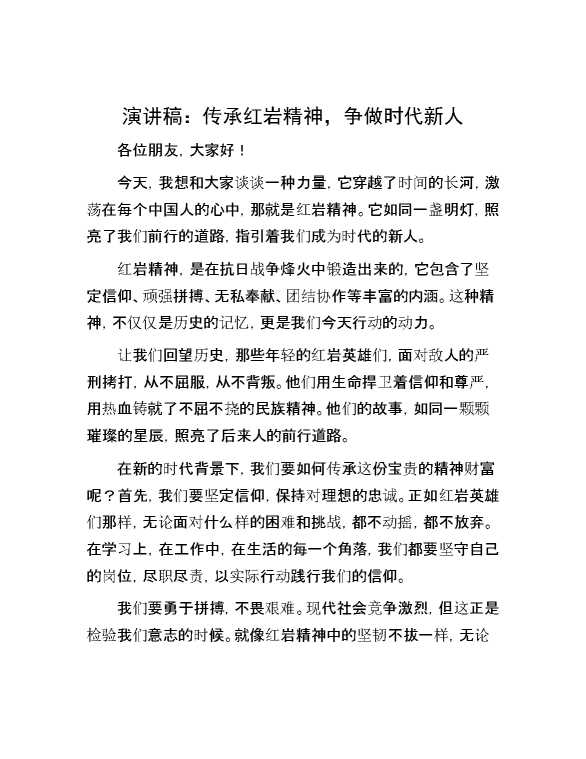演讲稿:传承红岩精神,争做时代新人 2024-07-16 Word模板 104 购买前,请一定要先点击这里看看,欢迎持续关注,精彩模板每天推送 预览结束,本文件为word文档,一共2页,共706字,请购买后,下载后查看 购买前,请一定要先点击这里看看,欢迎持续关注,精彩模板每天推送 资源下载下载价格29 RMBVIP免费升级VIP点击检测网盘有效后购买有任何充值和下载问题请加微信:xuexixuexi66 0 演讲发言