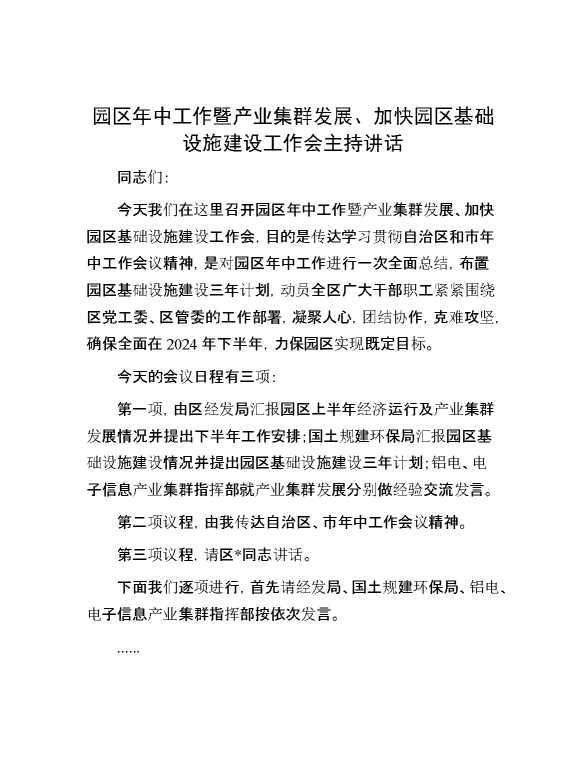 园区年中工作暨产业集群发展、加快园区基础设施建设工作会主持讲话 2024-07-16 Word模板 106 购买前,请一定要先点击这里看看,欢迎持续关注,精彩模板每天推送 预览结束,本文件为word文档,一共6页,共2283字,请购买后,下载后查看 购买前,请一定要先点击这里看看,欢迎持续关注,精彩模板每天推送 资源下载下载价格29 RMBVIP免费升级VIP点击检测网盘有效后购买有任何充值和下载问题请加微信:xuexixuexi66 0 演讲发言