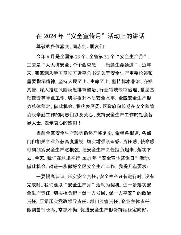 在2024年“安全宣传月”活动上的讲话 2024-07-16 Word模板 112 购买前,请一定要先点击这里看看,欢迎持续关注,精彩模板每天推送 预览结束,本文件为word文档,一共2页,共907字,请购买后,下载后查看 购买前,请一定要先点击这里看看,欢迎持续关注,精彩模板每天推送 资源下载下载价格29 RMBVIP免费升级VIP点击检测网盘有效后购买有任何充值和下载问题请加微信:xuexixuexi66 0 演讲发言