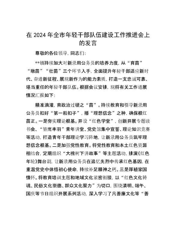 在2024年全市年轻干部队伍建设工作推进会上的发言 2024-07-16 Word模板 108 购买前,请一定要先点击这里看看,欢迎持续关注,精彩模板每天推送 预览结束,本文件为word文档,一共3页,共1173字,请购买后,下载后查看 购买前,请一定要先点击这里看看,欢迎持续关注,精彩模板每天推送 资源下载下载价格29 RMBVIP免费升级VIP点击检测网盘有效后购买有任何充值和下载问题请加微信:xuexixuexi66 0 演讲发言