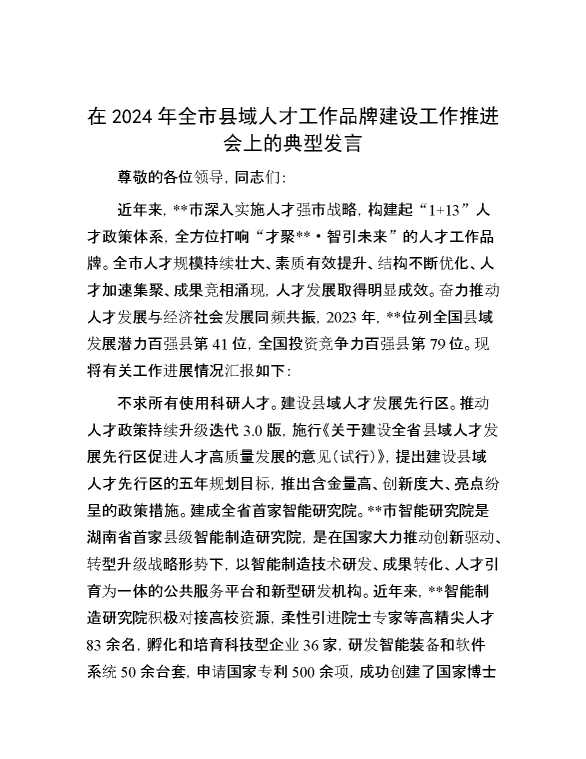 在2024年全市县域人才工作品牌建设工作推进会上的典型发言 2024-07-16 Word模板 113 购买前,请一定要先点击这里看看,欢迎持续关注,精彩模板每天推送 预览结束,本文件为word文档,一共4页,共1561字,请购买后,下载后查看 购买前,请一定要先点击这里看看,欢迎持续关注,精彩模板每天推送 资源下载下载价格29 RMBVIP免费升级VIP点击检测网盘有效后购买有任何充值和下载问题请加微信:xuexixuexi66 0 演讲发言