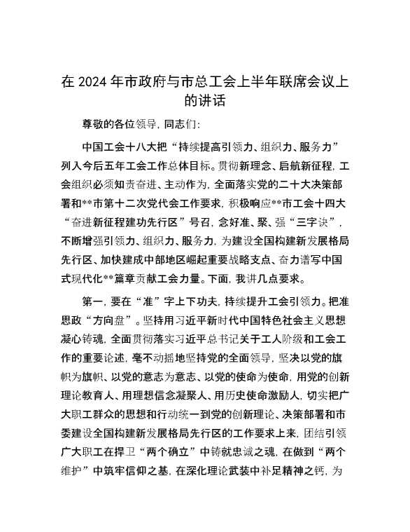 在2024年市政府与市总工会上半年联席会议上的讲话 2024-07-16 Word模板 122 购买前,请一定要先点击这里看看,欢迎持续关注,精彩模板每天推送 预览结束,本文件为word文档,一共5页,共2355字,请购买后,下载后查看 购买前,请一定要先点击这里看看,欢迎持续关注,精彩模板每天推送 资源下载下载价格29 RMBVIP免费升级VIP点击检测网盘有效后购买有任何充值和下载问题请加微信:xuexixuexi66 0 演讲发言