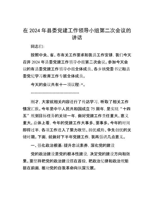 在2024年县委党建工作领导小组第二次会议的讲话 2024-07-16 Word模板 126 购买前,请一定要先点击这里看看,欢迎持续关注,精彩模板每天推送 预览结束,本文件为word文档,一共6页,共2647字,请购买后,下载后查看 购买前,请一定要先点击这里看看,欢迎持续关注,精彩模板每天推送 资源下载下载价格29 RMBVIP免费升级VIP点击检测网盘有效后购买有任何充值和下载问题请加微信:xuexixuexi66 0 演讲发言