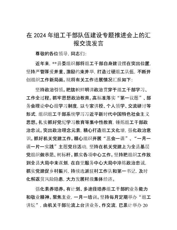 在2024年组工干部队伍建设专题推进会上的汇报交流发言 2024-07-16 Word模板 139 购买前,请一定要先点击这里看看,欢迎持续关注,精彩模板每天推送 预览结束,本文件为word文档,一共3页,共1321字,请购买后,下载后查看 购买前,请一定要先点击这里看看,欢迎持续关注,精彩模板每天推送 资源下载下载价格29 RMBVIP免费升级VIP点击检测网盘有效后购买有任何充值和下载问题请加微信:xuexixuexi66 0 演讲发言