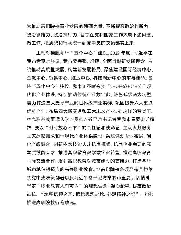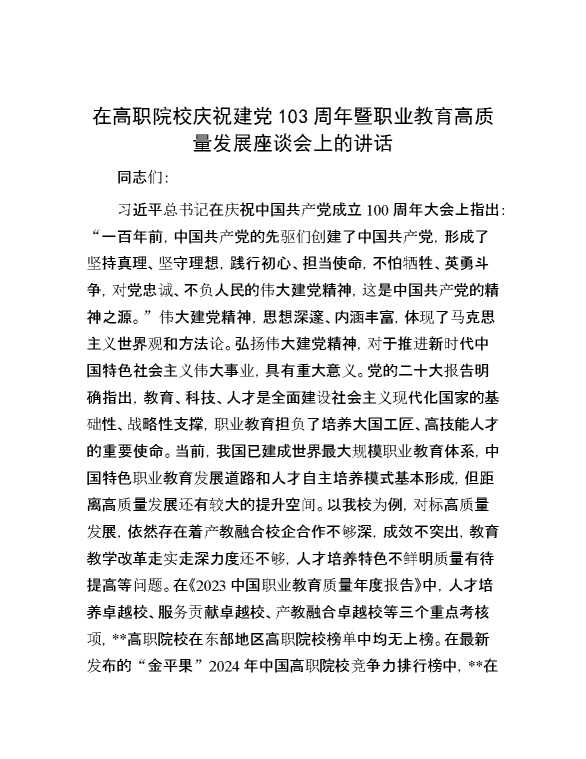 在高职院校庆祝建党103周年暨职业教育高质量发展座谈会上的讲话 2024-07-16 Word模板 133 购买前,请一定要先点击这里看看,欢迎持续关注,精彩模板每天推送 预览结束,本文件为word文档,一共9页,共4145字,请购买后,下载后查看 购买前,请一定要先点击这里看看,欢迎持续关注,精彩模板每天推送 资源下载下载价格29 RMBVIP免费升级VIP点击检测网盘有效后购买有任何充值和下载问题请加微信:xuexixuexi66 0 演讲发言