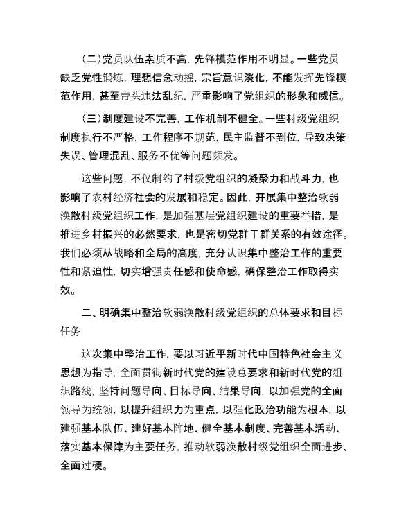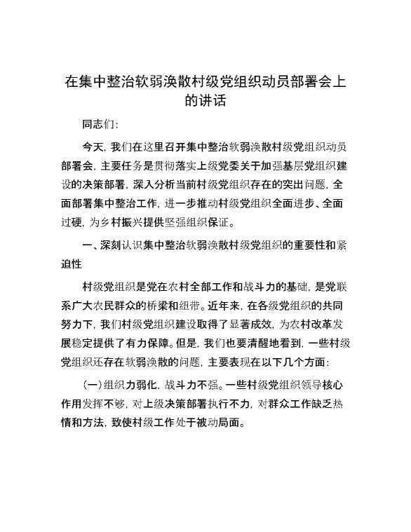 在集中整治软弱涣散村级党组织动员部署会上的讲话 2024-07-16 Word模板 106 购买前,请一定要先点击这里看看,欢迎持续关注,精彩模板每天推送 预览结束,本文件为word文档,一共5页,共2018字,请购买后,下载后查看 购买前,请一定要先点击这里看看,欢迎持续关注,精彩模板每天推送 资源下载下载价格29 RMBVIP免费升级VIP点击检测网盘有效后购买有任何充值和下载问题请加微信:xuexixuexi66 0 演讲发言