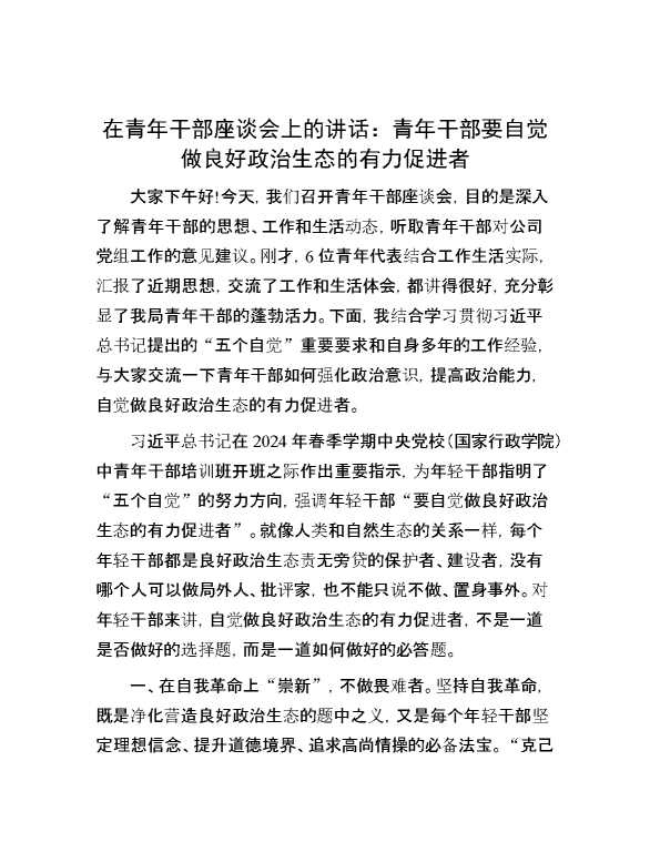在青年干部座谈会上的讲话:青年干部要自觉做良好政治生态的有力促进者 2024-07-16 Word模板 134 购买前,请一定要先点击这里看看,欢迎持续关注,精彩模板每天推送 预览结束,本文件为word文档,一共3页,共1315字,请购买后,下载后查看 购买前,请一定要先点击这里看看,欢迎持续关注,精彩模板每天推送 资源下载下载价格29 RMBVIP免费升级VIP点击检测网盘有效后购买有任何充值和下载问题请加微信:xuexixuexi66 0 演讲发言
