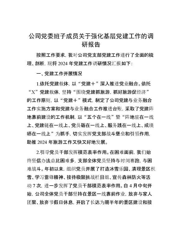 公司党委班子成员关于强化基层党建工作的调研报告 2024-07-20 Word模板 114 购买前,请一定要先点击这里看看,欢迎持续关注,精彩模板每天推送 预览结束,本文件为word文档,一共6页,共2428字,请购买后,下载后查看 购买前,请一定要先点击这里看看,欢迎持续关注,精彩模板每天推送 资源下载下载价格29 RMBVIP免费升级VIP点击检测网盘有效后购买有任何充值和下载问题请加微信:xuexixuexi66 0 总结汇报