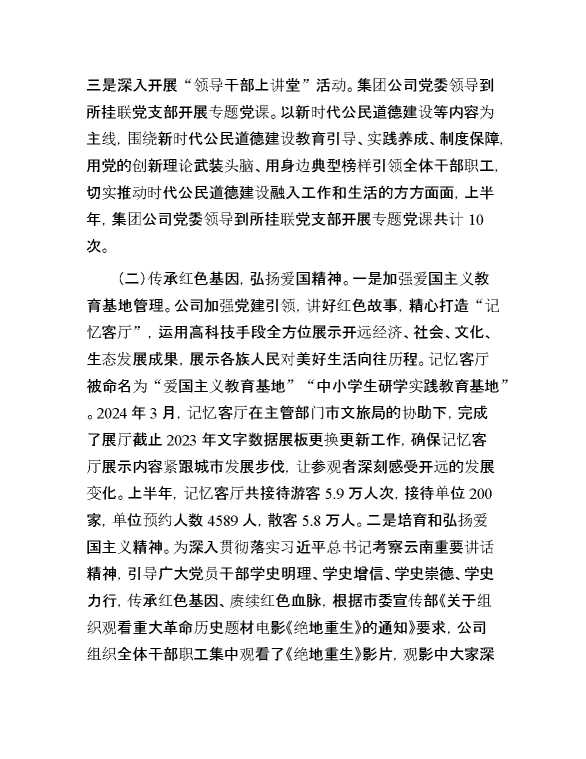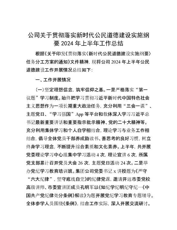 公司关于贯彻落实新时代公民道德建设实施纲要2024年上半年工作总结 2024-07-20 Word模板 108 购买前,请一定要先点击这里看看,欢迎持续关注,精彩模板每天推送 预览结束,本文件为word文档,一共8页,共3925字,请购买后,下载后查看 购买前,请一定要先点击这里看看,欢迎持续关注,精彩模板每天推送 资源下载下载价格29 RMBVIP免费升级VIP点击检测网盘有效后购买有任何充值和下载问题请加微信:xuexixuexi66 0 总结汇报