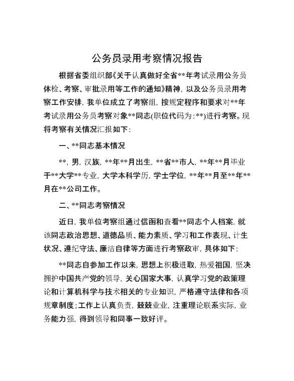 公务员录用考察情况报告 2024-07-20 Word模板 129 购买前,请一定要先点击这里看看,欢迎持续关注,精彩模板每天推送 预览结束,本文件为word文档,一共2页,共581字,请购买后,下载后查看 购买前,请一定要先点击这里看看,欢迎持续关注,精彩模板每天推送 资源下载下载价格29 RMBVIP免费升级VIP点击检测网盘有效后购买有任何充值和下载问题请加微信:xuexixuexi66 0 总结汇报