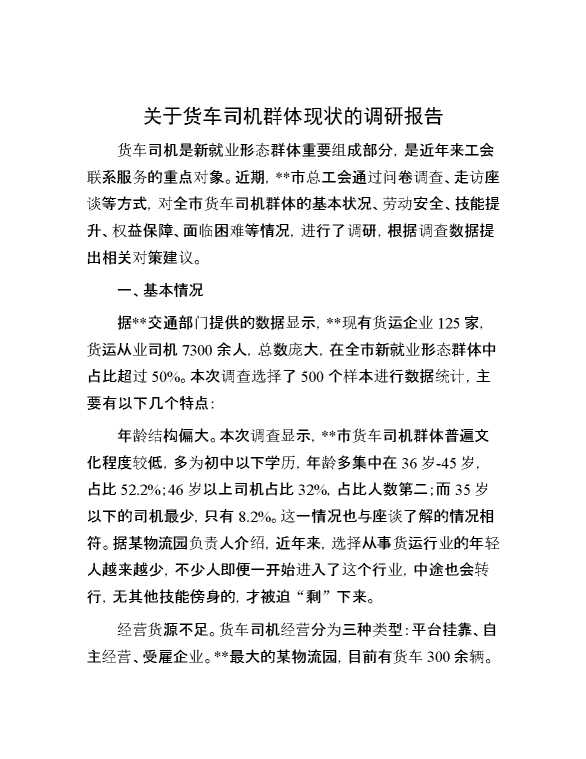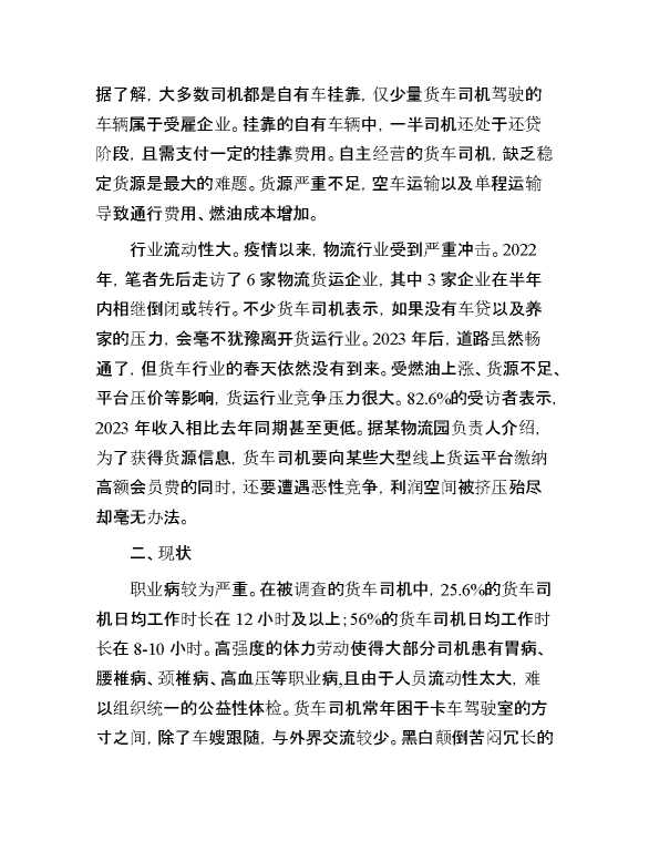 关于货车司机群体现状的调研报告 2024-07-20 Word模板 122 购买前,请一定要先点击这里看看,欢迎持续关注,精彩模板每天推送 预览结束,本文件为word文档,一共5页,共2147字,请购买后,下载后查看 购买前,请一定要先点击这里看看,欢迎持续关注,精彩模板每天推送 资源下载下载价格29 RMBVIP免费升级VIP点击检测网盘有效后购买有任何充值和下载问题请加微信:xuexixuexi66 0 总结汇报