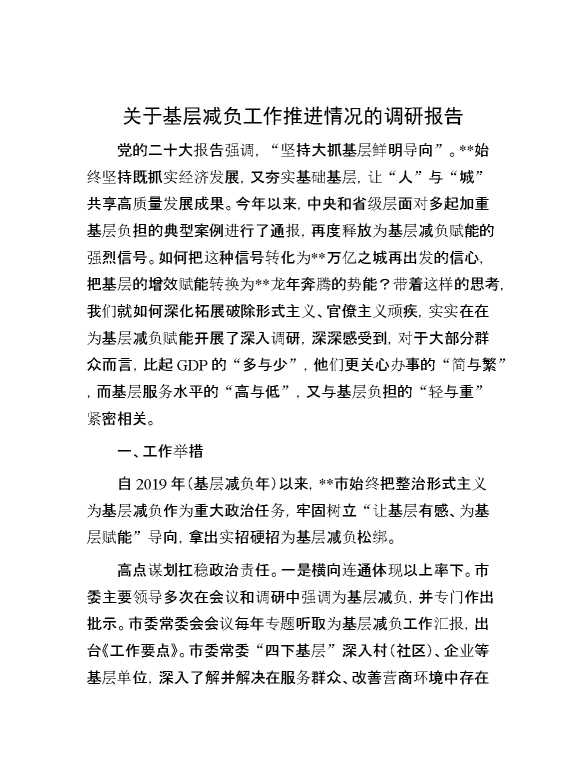 关于基层减负工作推进情况的调研报告 2024-07-20 Word模板 110 购买前,请一定要先点击这里看看,欢迎持续关注,精彩模板每天推送 预览结束,本文件为word文档,一共8页,共3756字,请购买后,下载后查看 购买前,请一定要先点击这里看看,欢迎持续关注,精彩模板每天推送 资源下载下载价格29 RMBVIP免费升级VIP点击检测网盘有效后购买有任何充值和下载问题请加微信:xuexixuexi66 0 总结汇报