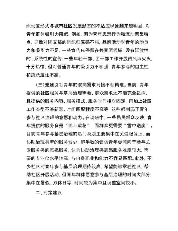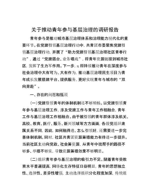 关于推动青年参与基层治理的调研报告 2024-07-20 Word模板 119 购买前,请一定要先点击这里看看,欢迎持续关注,精彩模板每天推送 预览结束,本文件为word文档,一共5页,共2109字,请购买后,下载后查看 购买前,请一定要先点击这里看看,欢迎持续关注,精彩模板每天推送 资源下载下载价格29 RMBVIP免费升级VIP点击检测网盘有效后购买有任何充值和下载问题请加微信:xuexixuexi66 0 总结汇报