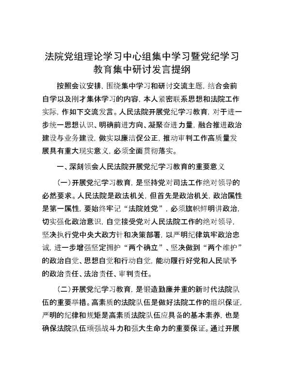 法院党组理论学习中心组集中学习暨党纪学习教育集中研讨发言提纲 2024-07-23 Word模板 123 购买前,请一定要先点击这里看看,欢迎持续关注,精彩模板每天推送 预览结束,本文件为word文档,一共5页,共2252字,请购买后,下载后查看 购买前,请一定要先点击这里看看,欢迎持续关注,精彩模板每天推送 资源下载下载价格29 RMBVIP免费升级VIP点击检测网盘有效后购买有任何充值和下载问题请加微信:xuexixuexi66 0 演讲发言