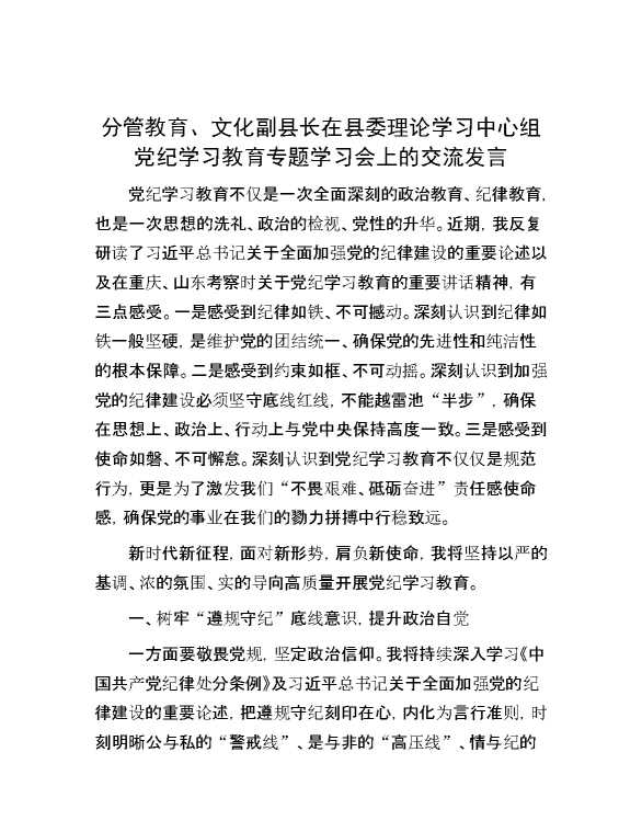 分管教育、文化副县长在县委理论学习中心组党纪学习教育专题学习会上的交流发言 2024-07-23 Word模板 126 购买前,请一定要先点击这里看看,欢迎持续关注,精彩模板每天推送 预览结束,本文件为word文档,一共3页,共1199字,请购买后,下载后查看 购买前,请一定要先点击这里看看,欢迎持续关注,精彩模板每天推送 资源下载下载价格29 RMBVIP免费升级VIP点击检测网盘有效后购买有任何充值和下载问题请加微信:xuexixuexi66 0 演讲发言
