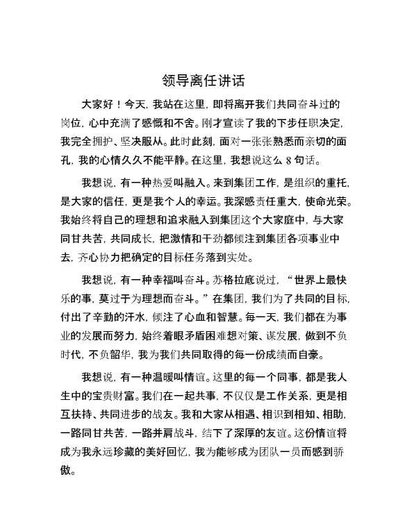 领导离任讲话 2024-07-23 Word模板 110 购买前,请一定要先点击这里看看,欢迎持续关注,精彩模板每天推送 预览结束,本文件为word文档,一共3页,共1171字,请购买后,下载后查看 购买前,请一定要先点击这里看看,欢迎持续关注,精彩模板每天推送 资源下载下载价格29 RMBVIP免费升级VIP点击检测网盘有效后购买有任何充值和下载问题请加微信:xuexixuexi66 0 演讲发言