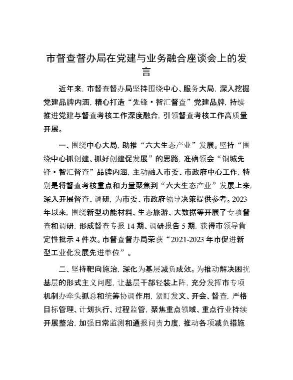 市督查督办局在党建与业务融合座谈会上的发言 2024-07-23 Word模板 108 购买前,请一定要先点击这里看看,欢迎持续关注,精彩模板每天推送 预览结束,本文件为word文档,一共2页,共953字,请购买后,下载后查看 购买前,请一定要先点击这里看看,欢迎持续关注,精彩模板每天推送 资源下载下载价格29 RMBVIP免费升级VIP点击检测网盘有效后购买有任何充值和下载问题请加微信:xuexixuexi66 0 演讲发言