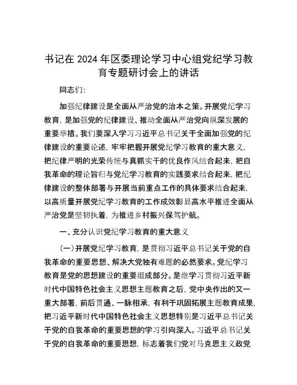 书记在2024年区委理论学习中心组党纪学习教育专题研讨会上的讲话 2024-07-23 Word模板 113 购买前,请一定要先点击这里看看,欢迎持续关注,精彩模板每天推送 预览结束,本文件为word文档,一共9页,共4180字,请购买后,下载后查看 购买前,请一定要先点击这里看看,欢迎持续关注,精彩模板每天推送 资源下载下载价格29 RMBVIP免费升级VIP点击检测网盘有效后购买有任何充值和下载问题请加微信:xuexixuexi66 0 演讲发言