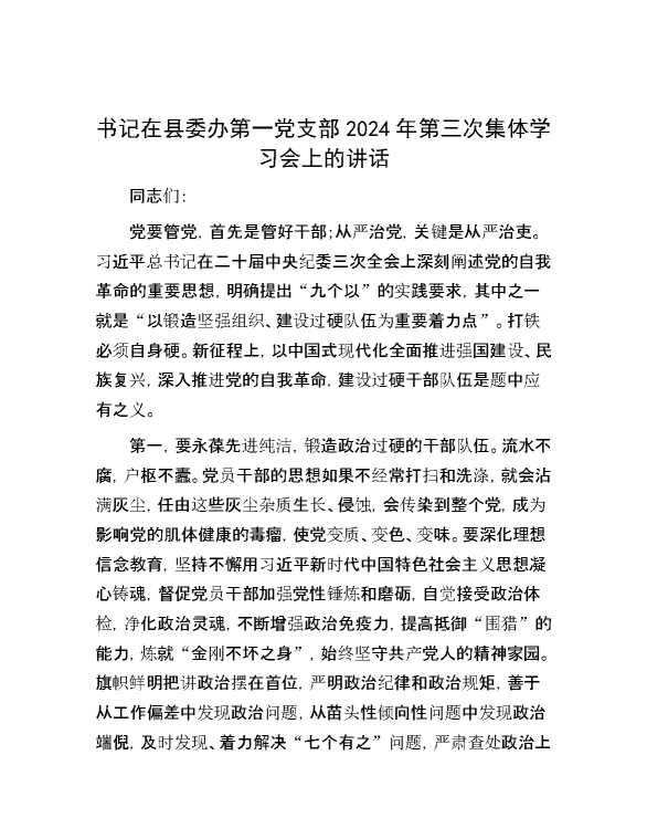 书记在县委办第一党支部2024年第三次集体学习会上的讲话 2024-07-23 Word模板 107 购买前,请一定要先点击这里看看,欢迎持续关注,精彩模板每天推送 预览结束,本文件为word文档,一共3页,共1444字,请购买后,下载后查看 购买前,请一定要先点击这里看看,欢迎持续关注,精彩模板每天推送 资源下载下载价格29 RMBVIP免费升级VIP点击检测网盘有效后购买有任何充值和下载问题请加微信:xuexixuexi66 0 演讲发言