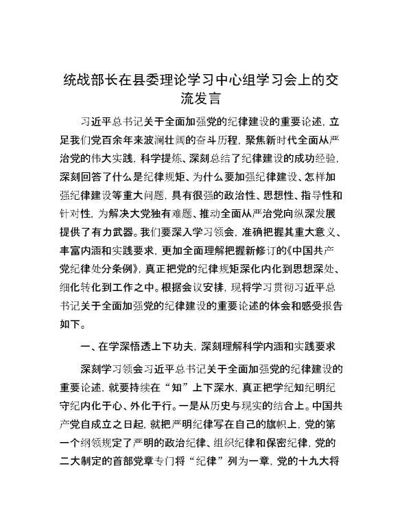 统战部长在县委理论学习中心组学习会上的交流发言 2024-07-23 Word模板 111 购买前,请一定要先点击这里看看,欢迎持续关注,精彩模板每天推送 预览结束,本文件为word文档,一共4页,共2032字,请购买后,下载后查看 购买前,请一定要先点击这里看看,欢迎持续关注,精彩模板每天推送 资源下载下载价格29 RMBVIP免费升级VIP点击检测网盘有效后购买有任何充值和下载问题请加微信:xuexixuexi66 0 演讲发言