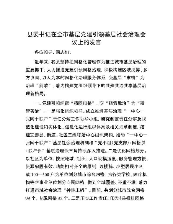 县委书记在全市基层党建引领基层社会治理会议上的发言 2024-07-23 Word模板 108 购买前,请一定要先点击这里看看,欢迎持续关注,精彩模板每天推送 预览结束,本文件为word文档,一共4页,共1544字,请购买后,下载后查看 购买前,请一定要先点击这里看看,欢迎持续关注,精彩模板每天推送 资源下载下载价格29 RMBVIP免费升级VIP点击检测网盘有效后购买有任何充值和下载问题请加微信:xuexixuexi66 0 演讲发言