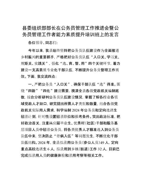 县委组织部部长在公务员管理工作推进会暨公务员管理工作者能力素质提升培训班上的发言 2024-07-23 Word模板 115 购买前,请一定要先点击这里看看,欢迎持续关注,精彩模板每天推送 预览结束,本文件为word文档,一共3页,共1420字,请购买后,下载后查看 购买前,请一定要先点击这里看看,欢迎持续关注,精彩模板每天推送 资源下载下载价格29 RMBVIP免费升级VIP点击检测网盘有效后购买有任何充值和下载问题请加微信:xuexixuexi66 0 演讲发言