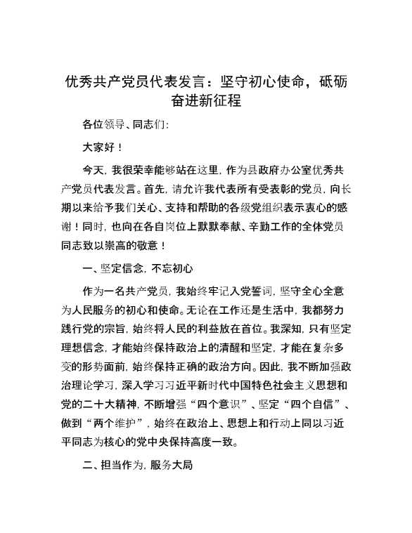 优秀共产党员代表发言:坚守初心使命,砥砺奋进新征程 2024-07-23 Word模板 149 购买前,请一定要先点击这里看看,欢迎持续关注,精彩模板每天推送 预览结束,本文件为word文档,一共4页,共1456字,请购买后,下载后查看 购买前,请一定要先点击这里看看,欢迎持续关注,精彩模板每天推送 资源下载下载价格29 RMBVIP免费升级VIP点击检测网盘有效后购买有任何充值和下载问题请加微信:xuexixuexi66 0 演讲发言