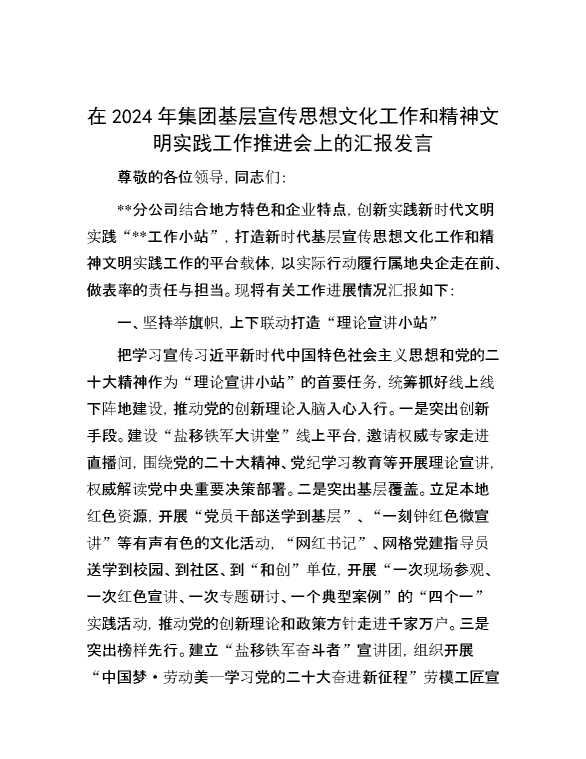 在2024年集团基层宣传思想文化工作和精神文明实践工作推进会上的汇报发言 2024-07-23 Word模板 119 购买前,请一定要先点击这里看看,欢迎持续关注,精彩模板每天推送 预览结束,本文件为word文档,一共4页,共1844字,请购买后,下载后查看 购买前,请一定要先点击这里看看,欢迎持续关注,精彩模板每天推送 资源下载下载价格29 RMBVIP免费升级VIP点击检测网盘有效后购买有任何充值和下载问题请加微信:xuexixuexi66 0 演讲发言