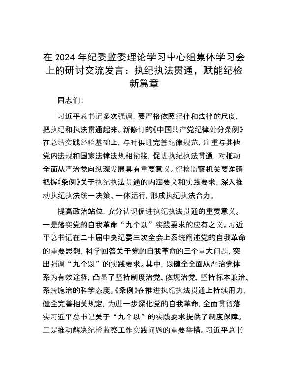 在2024年纪委监委理论学习中心组集体学习会上的研讨交流发言:执纪执法贯通,赋能纪检新篇章 2024-07-23 Word模板 120 购买前,请一定要先点击这里看看,欢迎持续关注,精彩模板每天推送 预览结束,本文件为word文档,一共5页,共2485字,请购买后,下载后查看 购买前,请一定要先点击这里看看,欢迎持续关注,精彩模板每天推送 资源下载下载价格29 RMBVIP免费升级VIP点击检测网盘有效后购买有任何充值和下载问题请加微信:xuexixuexi66 0 演讲发言